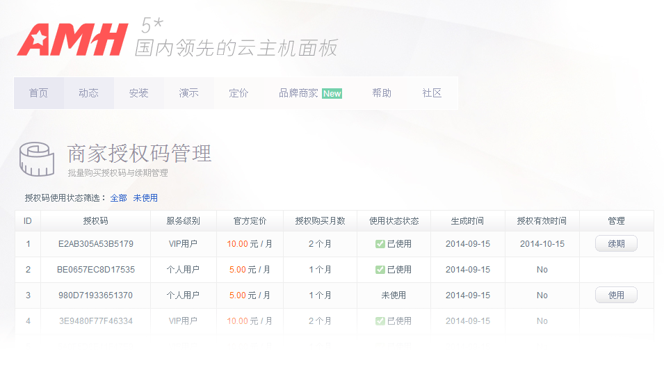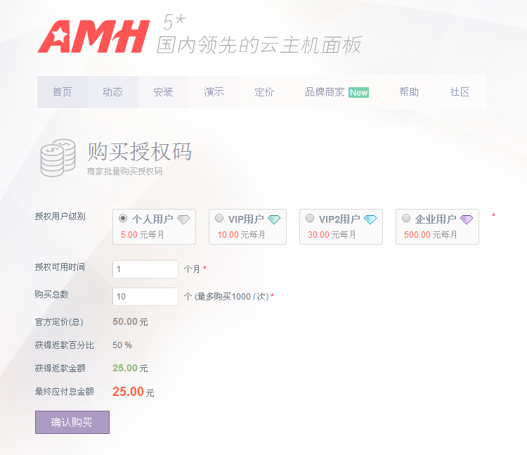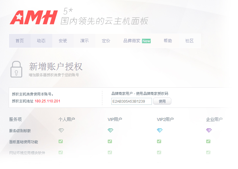 品牌商家认证特权 1) 商家拥有官方品牌可信认证。 2) 商家拥有批量授权码权限。 3) 商家拥有官方所有不同服务定价的授权返款资格。(首次授权/ 续期授权以商家级别返款) 4) 商家可为用户付费购买授权码,用户免其费用授权使用官方产品。 5) 商家的用户使用授权码同样拥有官方相同定价的各项服务。 品牌商家授权码管理 商家管理已购买的授权码、进行续期等。 ![]() 品牌商家购买授权码 可选择购买不同的授权级别、可购买指定个月数,同时可批量购买。 ![]() 用户使用品牌商家授权码 用户使用品牌商家授权码即可免购买直接授权。 ![]() 品牌商家认证 - 详情介绍 http://amh.sh/sell.htm amh.sh 2014-09-15