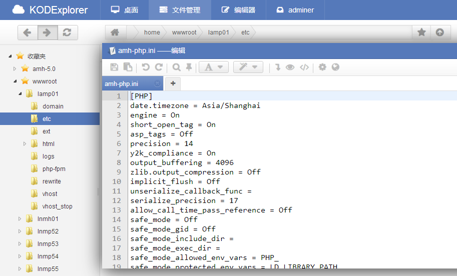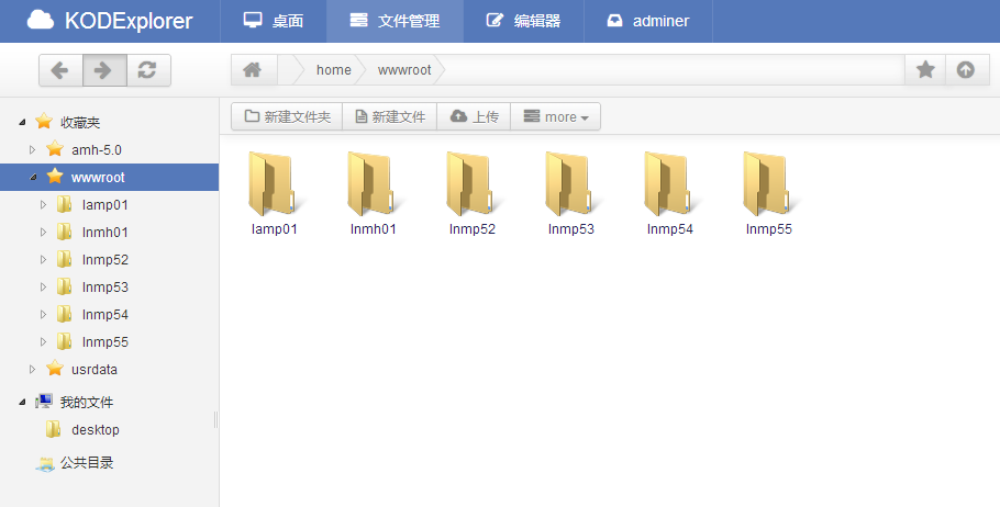 模块分类:应用软件 模块类别:WEB应用程序 版本号:2.7.3 kodexplorer-2.7.3 介绍 引用: KODExplorer是一个公开源码的基于Web的在线文件管理、代码编辑器。它提供了类windows经典用户界面,一整套在线文件管理、文件预览、编辑、上传下载、在线解压缩、音乐播放功能。让你直接在浏览器端实现web开发、源码文件预览、网站部署的同时拥有与本地操作一样方便、快捷、安全的体验。(默认管理员密码amh:amh_password) 发布时间:2014-09-22 当初AMH与KODExplorer都为同届阿里云开发者大赛的参赛作品。 KODExplorer设计与用户体验方面都做得挺好,推荐大家使用。 模块功能: 1) 支持管理AMH不同环境下所有文件与所有环境配置。 2) 每次安装都随机安装目录避免非管理员访问。 3) 面板提供权限重置功能。重置kodexplorer的数据目录与/home/wwwroot目录权限。 4) 考虑浏览器记录账号密码。默认账号密码amh amh_password 避免与面板账号相同,安装后请修改密码。 目前模块已上架。登录面板下载软件图标会有更新提示,下载安装即可使用。 AMH - KODExplorer 1.png ![]() AMH - KODExplorer 2.png