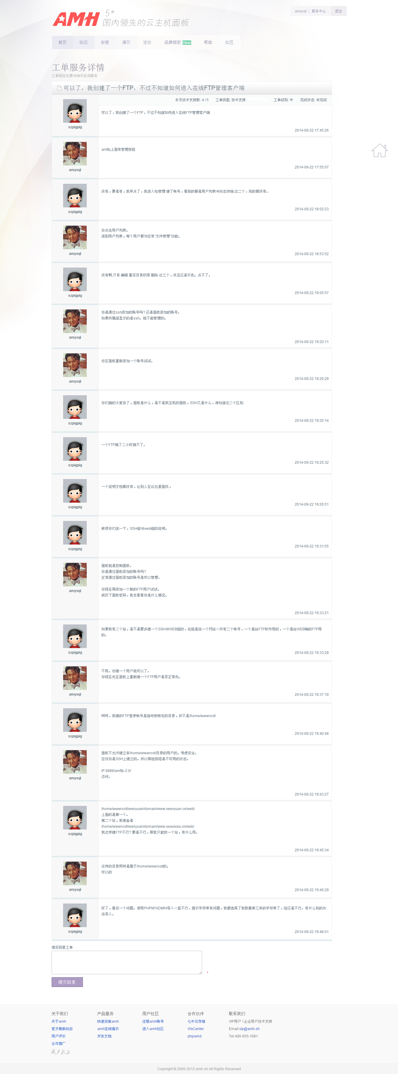 2. 你解压多大文件。amftp是php脚本的。很多方面都会受php配置影响。可以改下配置。 工单我这边是以优化级回应的。 现在在答复处理VIP用户一些问题。 虽然现在都不是在服务响应时间了。 楼主你先看看能解决不先吧。 你是今天授权使用的。 或我这边退回你5元支付宝,你先用其它面板? 什么时候你想回到AMH再来。 另一FTP问题。 工单服务详情 amh.sh.png
