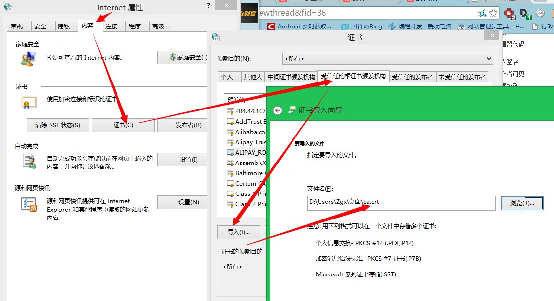 (注意,如果您使用火狐浏览器,你需要进入火狐浏览器设置里导入,因为火狐浏览器使用自己的证书管理)。