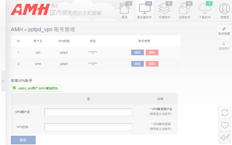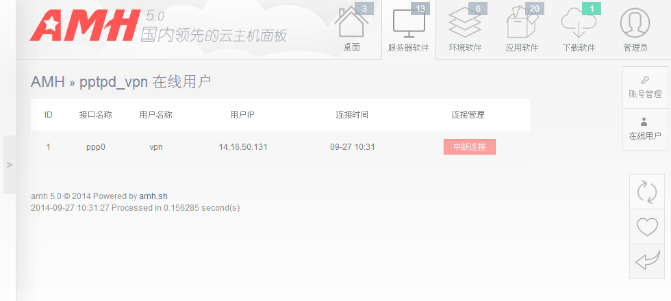 模块分类:服务器软件 模块类别:V_PN服务器 版本号:1.0 pp_tpd_v_pn-1.0 介绍 引用: AMH面板的V_PN模块pp_tpd_v_pn。PP_TP(PP_TP: Point to Point Tunneling Protocol)是一种支持多协议虚拟专用网络的网络技术(V_PN)。虚拟专用网络可以把它理解成是虚拟出来的企业内部专线,通过特殊的加密的通讯协议在连接在Internet上的位于不同地方的两个或多个企业内部网之间建立一条专有的通讯线路。 发布时间:2014-09-27 目前1.0版本已下架,请所有pp_tpd_v_pn用户安装升级1.1版本。 模块功能: 1) 支持添加、编辑、删除V_PN账号。 2) 支持查看在线V_PN的用户,可查看用户IP、连接时间等。并可中断连接。 3) 删除、编辑用户密码可自动中断用户连接。 目前模块已上架。登录面板下载软件图标会有更新提示,下载安装即可使用。 amh-pp_tpd_v_pn1.gif ![]() amh-pp_tpd_v_pn2.gif