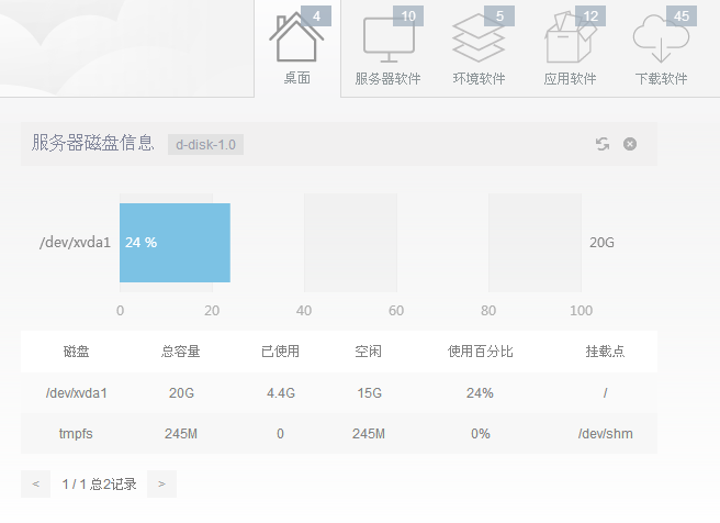 模块分类:应用软件 模块类别:桌面程序 版本号:1.0 d-disk-1.0 介绍 引用: 发布时间:2014-10-30桌面应用程序,查看服务器磁盘使用情况,包括各个磁盘挂载点,使用容量等状态。 目前桌面程序已上架。登录面板下载软件图标会有更新提示, 下载即可直接使用。 ![]() ![]()