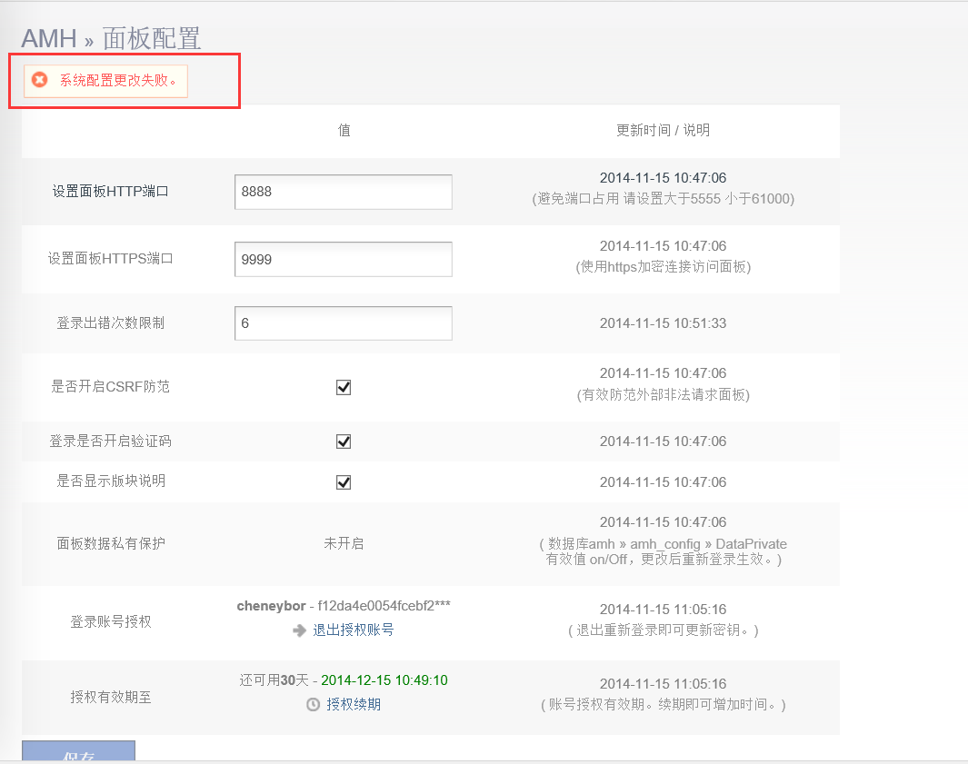 解决5.0授权信息没能保存问题 http://amh.sh/bbs/post-3920-1-1.htm 如果需要帮助,提交工单。