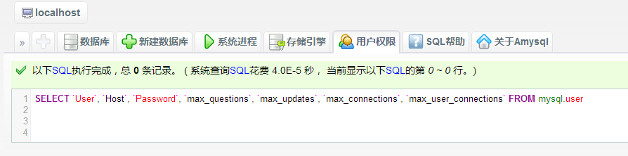mysql> select * from user; +-----------+------+-------------------------------------------+-------------+----- --------+-------------+-------------+-------------+-----------+-------------+------ ---------+--------------+-----------+------------+-----------------+------------+-- ----------+--------------+------------+-----------------------+------------------+- -------------+-----------------+------------------+------------------+------------- ---+---------------------+--------------------+------------------+------------+---- ----------+------------------------+----------+------------+-------------+--------- -----+---------------+-------------+-----------------+----------------------+------ --+-----------------------+ | Host | User | Password | Select_priv | Inse rt_priv | Update_priv | Delete_priv | Create_priv | Drop_priv | Reload_priv | Shutd own_priv | Process_priv | File_priv | Grant_priv | References_priv | Index_priv | A lter_priv | Show_db_priv | Super_priv | Create_tmp_table_priv | Lock_tables_priv | Execute_priv | Repl_slave_priv | Repl_client_priv | Create_view_priv | Show_view_pr iv | Create_routine_priv | Alter_routine_priv | Create_user_priv | Event_priv | Tri gger_priv | Create_tablespace_priv | ssl_type | ssl_cipher | x509_issuer | x509_sub ject | max_questions | max_updates | max_connections | max_user_connections | plugi n | authentication_string | +-----------+------+-------------------------------------------+-------------+----- --------+-------------+-------------+-------------+-----------+-------------+------ ---------+--------------+-----------+------------+-----------------+------------+-- ----------+--------------+------------+-----------------------+------------------+- -------------+-----------------+------------------+------------------+------------- ---+---------------------+--------------------+------------------+------------+---- ----------+------------------------+----------+------------+-------------+--------- -----+---------------+-------------+-----------------+----------------------+------ --+-----------------------+ | localhost | root | *E5D907fdsfadsfsdfsadfsdfasdf56BA2E | N | N | N | N | N | N | N | N | N | N | Y | N | N | N | N | N | N | N | N | N | N | N | N | N | N | N | N | N | N | | | | | 0 | 0 | 0 | 0 | | NULL | +-----------+------+-------------------------------------------+-------------+----- --------+-------------+-------------+-------------+-----------+-------------+------ ---------+--------------+-----------+------------+-----------------+------------+-- ----------+--------------+------------+-----------------------+------------------+- -------------+-----------------+------------------+------------------+------------- ---+---------------------+--------------------+------------------+------------+---- ----------+------------------------+----------+------------+-------------+--------- -----+---------------+-------------+-----------------+----------------------+------ --+-----------------------+ 1 row in set (0.00 sec) mysql>