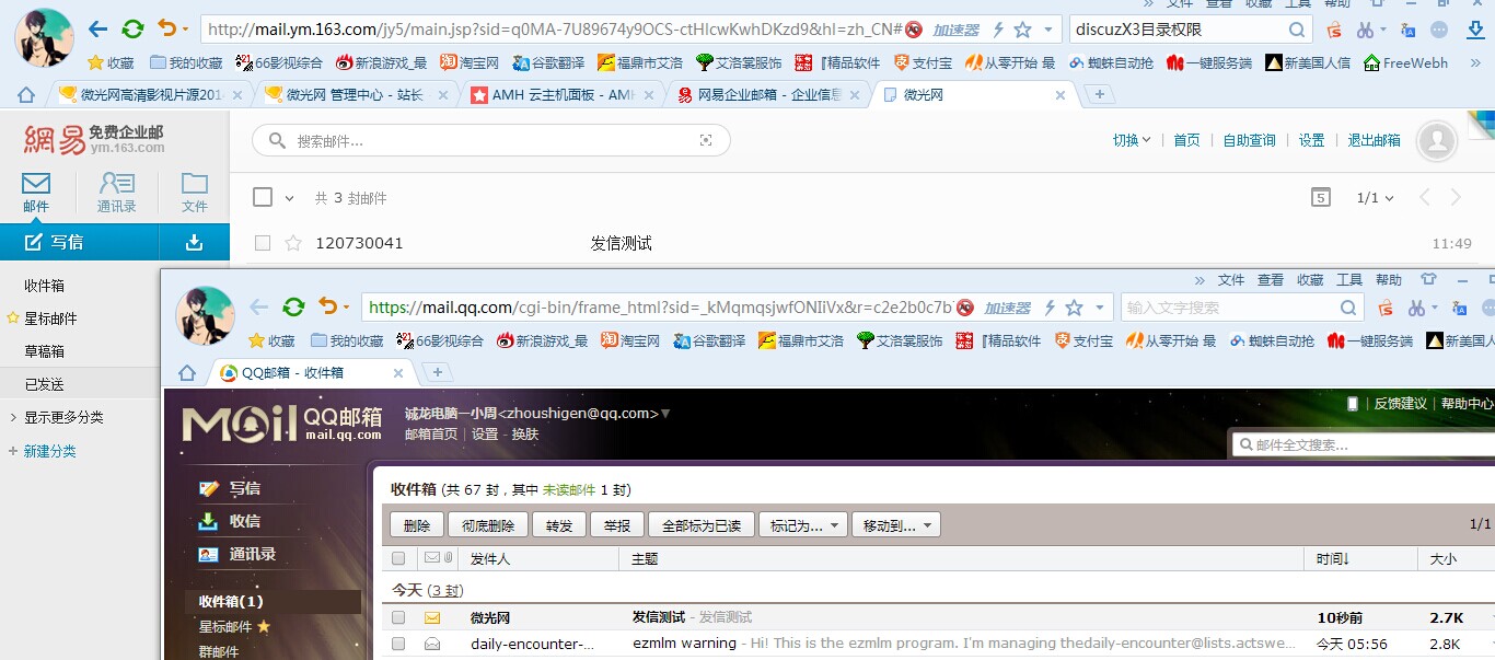 是的,我本地登录163企业邮箱,登录这个帐号给我QQ邮箱发邮件都是秒到,不知道为什么啊AMH5.0就发不出来,设置跟我以前设置是一样的,以前都不会发不出来。 不知道是哪里有问题 求助。 而且非常奇怪的,我以前用AMH4.2通信正常的,现在VPS格掉装5.0就通信失败了,同样的方法一模一样备份下来的论坛文件,而且后台UC的IP都设置了还是通信失败。以前都不会的,不知道哪里有问题,不知道管理可否帮我看一下。