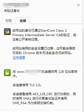 问题解决了 已经亮起绿色的小锁了。 用https://www.ssllabs.com/ssltest/index.html 这个网站查询你的HTTPS页面,然后一个一个的修复上面的问题就好了 我的问题是中间证书还是是用的sha1 所以不安全,把中间证书更新成sha2 就OK了。 不过还是有一个问题,谷歌,百度,均找不到答案,那就是怎么才能从TLS 1.0 变成TLS 1.2,还是一样谷歌百度都不行,apache的话,nginx的话教程就一大堆了,不知道为啥apache没人用SSL证书吗?,唉日后若有人解决次问题的麻烦告之医生啊。 ------------------------------------------------ 按照@liudiary 提供的教程设置了 http://amh.sh/bbs/post-4066-1-1.htm 最后还添加了两行行 SSLProtocol all -SSLv2 SSLCipherSuite ALL:!ADH:!EXPORT:!SSLv2:RC4+RSA:+HIGH:+MEDIUM (上面两行是发证书的商家提供的https://www.startssl.com/?app=21) 可是还是不行 谷歌最新版 浏览器上还是带小三角 不显示绿色小锁,请问如何设置才可以? 有人说是openssl漏洞没修复导致 但是在ssh下查询发现: openssl version –a usage:version -[avbofp] 没有版本号!在360的心血漏洞查询里,查询了没有此漏洞,我这就纠结死了。 ![]()
