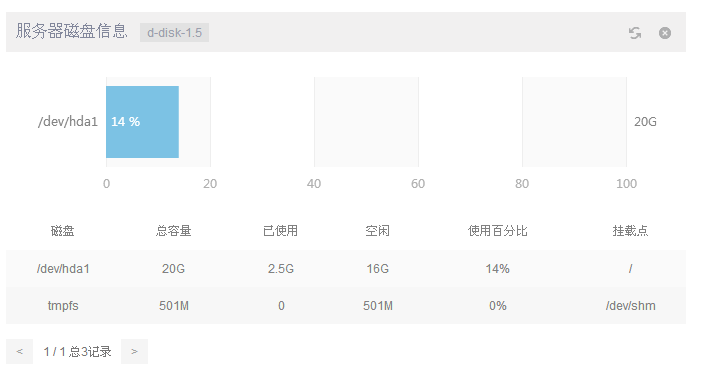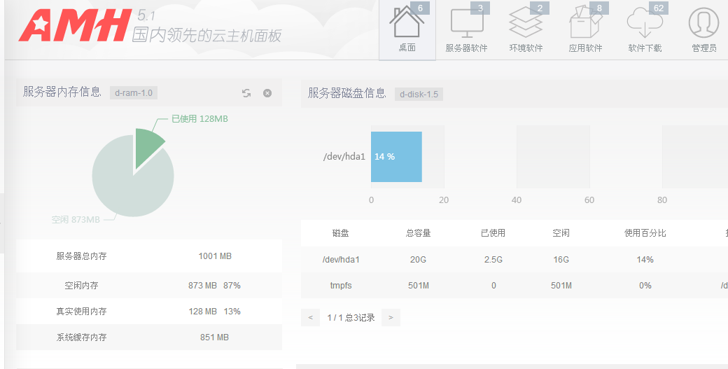 模块分类:应用软件 模块类别:桌面程序 版本号:1.5 d-disk-1.5 介绍 引用: 桌面应用程序,查看服务器磁盘使用情况,包括各个磁盘挂载点,使用容量等状态。 发布时间:2015-03-09 d-disk-1.5使用说明 适用于AMH 5.1版本, AMH 5.0版本的用户请先升级至AMH5.1。 http://amh.sh/bbs/post-5972-1-1.htm d-disk-1.5有更新1.0版本存在的一些细节问题,目前桌面程序已上架。 在使用d-disk-1.0版本的用户到应用软件列表升级d-disk即可。 如果是首次使用登录面板下载软件图标会有更新提示,下载即可直接使用。 d-disk-1.5 - AMH.png ![]() 桌面 AMH.png