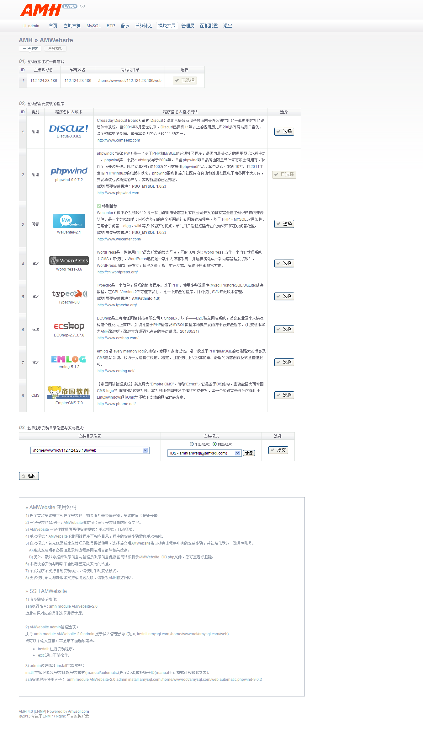 ----------------------------------------- 模块版本名称: AMWebsite-2.0 模块发布时间: 2013-08-08 模块描述: 引用: AMWebsite-2.0 AMH面板一键建站模块,快速安装搭建(Discuz、phpwind、WeCenter、WordPress、Typecho、ECShop)等网站程序。 1、面板线上下载&安装: AMH » Module » 下载模块 » 搜索 AMWebsite-2.0 下载。 回到模块管理列表点击安装即可。 2、或使用ssh命令下载&安装: amh module download AMWebsite-2.0; amh module AMWebsite-2.0 install; ----------------------------------------- 目前AMWebsite-1.0版本已下架。 在使用1.0版本的用户请下载安装升级(安装新版本旧版将自动卸载)。 AMWebsite-2.0 更新说明: 新版本更新1.0版本发现的问题。 与全部更新程序到目前最新版本、并增加新程序。 更新日志: 1、Discuz-3.0 2013-08-02最新版本。 2、phpwind-9.0 2013-07-02最新版本。 3、WeCenter-2.1 最新版本。 4、WordPress-3.6 最新版本。 5、ECShop-2.7.3 2013-07-08最新版本。 6、增加博客程序emlog-5.1.2。 7、增加CMS程序EmpireCMS-7.0。 8、修复AMWebsite-1.0版本DZ程序应用中心问题。 http://amysql.com/bbs/post-685-1-1.htm ----------------------------------------- ![]() 附、下载AMWebsite-2.0模块开发脚本: http://amysql.com/file/AMH/4.0/modules/AMWebsite-2.0.module.tar.gz