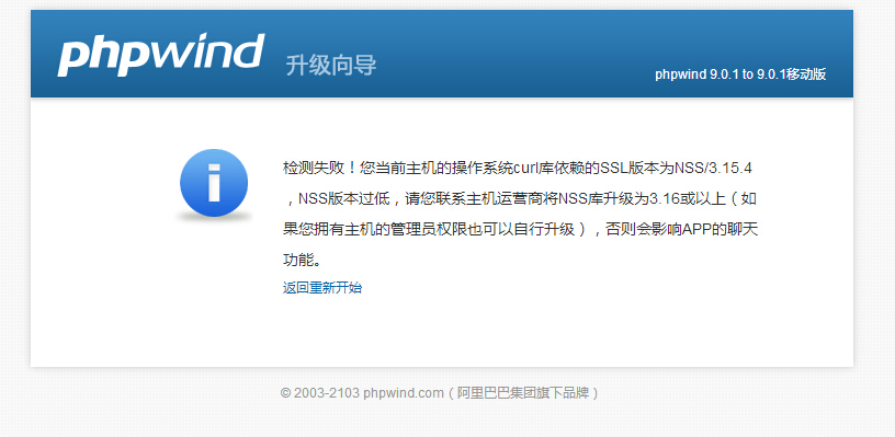 检测失败!您当前主机的操作系统curl库依赖的SSL版本为NSS/3.15.4,NSS版本过低,请您联系主机运营商将NSS库升级为3.16或以上(如果您拥有主机的管理员权限也可以自行升级),否则会影响APP的聊天功能。
