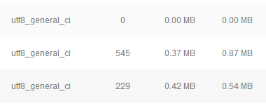 明白了,谢谢! 但是用Madmin建立数据库,用phpmyadmin导入sql文件,在数据库列表中始终显示表的数量和数据容量为0。 同样的方法建的前两个数据库正常,从第三个开始就成这样了,即使吧之前导入成功的sql导入到第三个数据库里,也是显示表数据为0,但其实表是存在的(排除数据库版本问题)。 最上面这个就是第三个数据库,数量和数据容量是0,其实里面有27个表,下面两个数据库是最初建的,能正常显示。