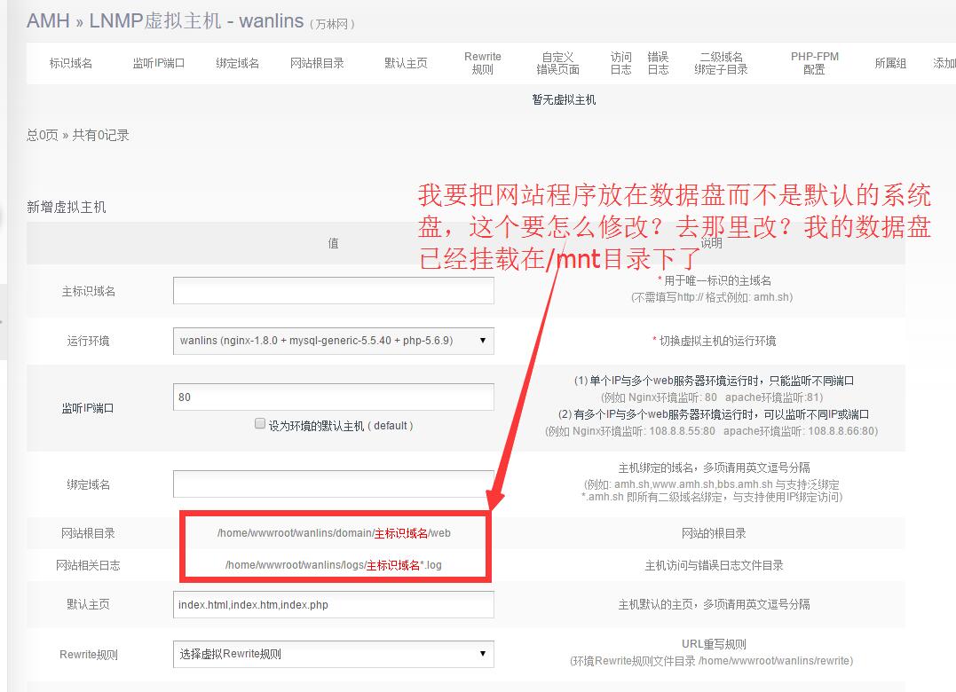 我的硬盘挂载在/mnt目录下,然后网站默认目录怎么修改啊,麻烦管理员解答一下,非常感谢