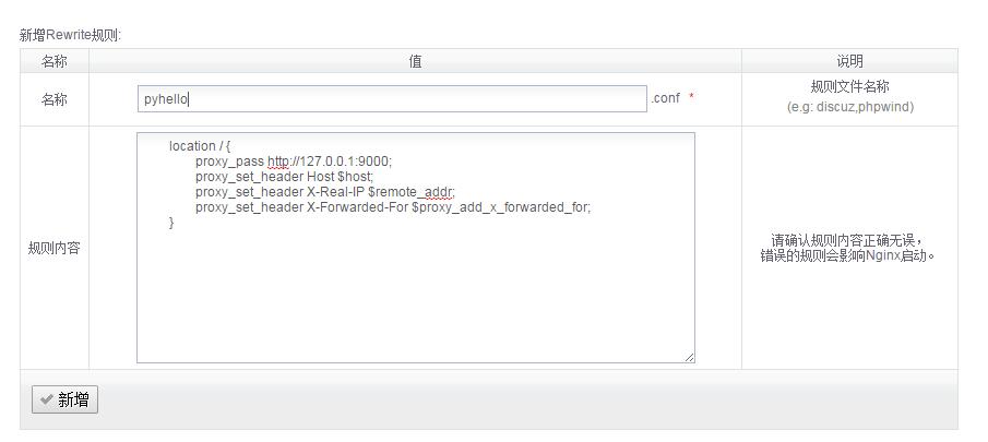 本文将描述如何使用 AMH 4.2 支持Python WEB程序的部署。 使用了 Gunicorn 来托管Python, AMH4.2默认的Ngnix来处理访问。 本文以 CentOS 6 为环境,其它版本Linux差不多 1. 首先检查主机有无安装 Python, SSH登陆主机验证: python -v CTRL+Z 退出Python 出来版本号2.6 之类的即可,要升级为 2.7 之类,百度一下如何升级。 2. 安装 Easy install 和 pip wget https://bootstrap.pypa.io/ez_setup.py --no-check-certificate python ez_setup.py wget https://bootstrap.pypa.io/get-pip.py --no-check-certificate python get-pip.py 3. 安装 Gunicorn pip install gunicorn 4. 检查Git 有无安装 git 如果没有git, 用 yum install git 安装 5. 下载示例程序并启动 git clone https://git.oschina.net/JiaFeiX/Py-Hello.git 进入目录 cd Py-Hello/ 安装依赖 pip install -r requirements.txt --allow-all-external 无打断的运行托管Python: nohup gunicorn hello:app -b 127.0.0.1:9000 --log-file - --access-logfile - --error-logfile - 此时出现: nohup: ignoring input and appending output to `nohup.out' 可以安全退出 SSH登陆窗口。 再次登陆SSH,该进程不会中断。 再次登陆后,用命令测试是否正常:curl http://127.0.0.1:9000 出来HTML 的页面,则表示正常。 6. 设置Ngnix站点 确定AMH安装了Rewrite模块 ![]() 新建一个 Rewrite规则, 在AMH的站点里选择 Rewrite模块,新建一个 ![]() pyhello.conf 的Rewrite文件 location / { proxy_pass http://127.0.0.1:9000; proxy_set_header Host $host; proxy_set_header X-Real-IP $remote_addr; proxy_set_header X-Forwarded-For $proxy_add_x_forwarded_for; } 新建一个 Ngnix 站点,并且制定Rewrite规则: ![]() 设定好 域名指向 pyhello.acyun.org 到 IP 然后访问: http://pyhello.acyun.org/ 正常。 结束。 ----- [WEB和云计算技术交流QQ群] 229593086