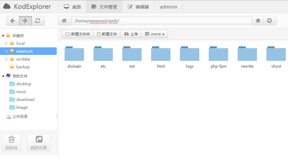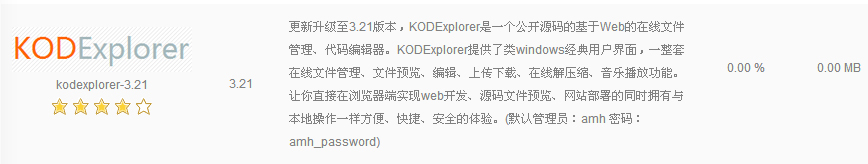模块分类:应用软件 模块类别:WEB应用程序 版本号:3.21 kodexplorer-3.21 介绍 引用: KODExplorer是一个公开源码的基于Web的在线文件管理、代码编辑器。KODExplorer提供了类windows经典用户界面,一整套在线文件管理、文件预览、编辑、上传下载、在线解压缩、音乐播放功能。让你直接在浏览器端实现web开发、源码文件预览、网站部署的同时拥有与本地操作一样方便、快捷、安全的体验。(默认管理员:amh 密码:amh_password) 发布时间:2015-11-11 kodexplorer-3.21 软件更新 适用于AMH 5.2版本, AMH 5.0、51版本的用户请先升级至AMH5.2。 https://amh.sh/bbs/post-7976-1-1.htm 模块功能: 1) 支持管理AMH不同环境下所有文件与所有环境配置。 2) 每次安装都随机安装目录避免非管理员访问。 3) 面板提供权限重置功能。重置kodexplorer的数据目录与/home/wwwroot目录权限。 默认账号为:amh 密码为:amh_password 安装后有必要请修改默认密码。 AMH-kodexplorer-3.21-2.jpg ![]() AMH-kodexplorer-3.21.jpg