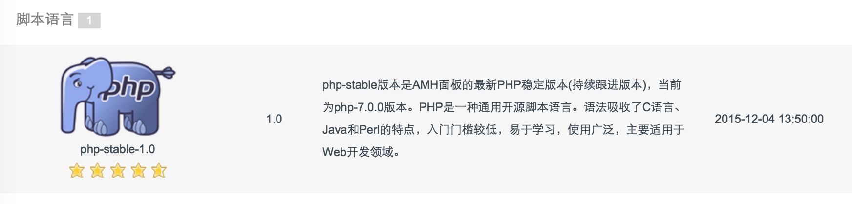 模块分类:服务器软件 模块类别:脚本语言 版本号:1.0 php-stable-1.0 介绍 引用: php-stable版本是AMH面板的最新PHP稳定版本(持续跟进版本),当前为php-7.0.0版本。PHP是一种通用开源脚本语言。语法吸收了C语言、Java和Perl的特点,入门门槛较低,易于学习,使用广泛,主要适用于Web开发领域。 发布时间:2015-12-04 关于php-stable-1.0 AMH的php-stable版本的PHP是目前官网发布的最新稳定版, 此版本在AMH平台上将会持续对PHP同步更新。 在PHP更新发布稳定同时,AMH会同时更新更进,在使用php-stable这个版本的用户, 这意味着您随时可以对AMH(lnmp/lamp)环境的PHP进行升级到最新稳定版本,不需再要做环境切换。 当前最新是php7.0。 PHP7除性能有极大提升与增加很多新特性外,相比以往的PHP老版本也有很大的差别, 部分扩展在PHP7已经不再能支持、如libmysql(需使用mysqli或pdo)、mssql、ereg扩展已经不再能使用。 在使用php7前,先确认您网站程序是否能运行于php7。 php-stable-1.0(php7.0.0).png