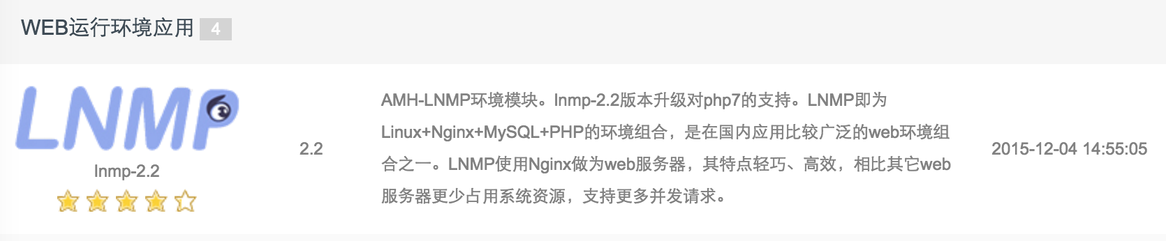 模块分类:环境软件 模块类别:WEB运行环境应用 版本号:2.2 lnmp-2.2 介绍 引用: AMH-LNMP环境模块。lnmp-2.2版本升级对php7的支持。LNMP即为Linux+Nginx+MySQL+PHP的环境组合,是在国内应用比较广泛的web环境组合之一。LNMP使用Nginx做为web服务器,其特点轻巧、高效,相比其它web服务器更少占用系统资源,支持更多并发请求。 发布时间:2015-12-04 lnmp-2.2 环境软件更新 lnmp-2.2版本主要更新是对php7的支持, 在使用 lnmp-2.1版本的用户,请到环境软件列表升级lnmp至2.2版本。 lnmp-2.2.png