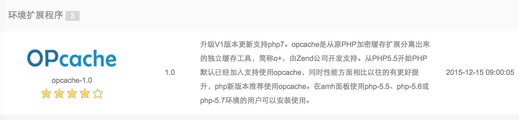 模块分类:应用软件 模块类别:环境扩展程序 版本号:1.0 opcache-1.0 介绍 引用: opcache是从原PHP加密缓存扩展分离出来的独立缓存工具,简称o+,由Zend公司开发支持。从PHP5.5开始PHP默认已经加入支持使用opcache,同时性能方面相比以往的有更好提升,php新版本推荐使用opcache。在amh面板使用php-5.5、php-5.6或php-5.7环境的用户可以安装使用。 发布时间:2015-12-15 opcache-1.0 (V1版本)说明 V1版本主要更新对PHP7的支持。 在使用PHP5.5、PHP5.6、PHP7的有户可以选择使用opcache模块。 对PHP源码起到缓存加速作用。 opcache-1.0_v1.png