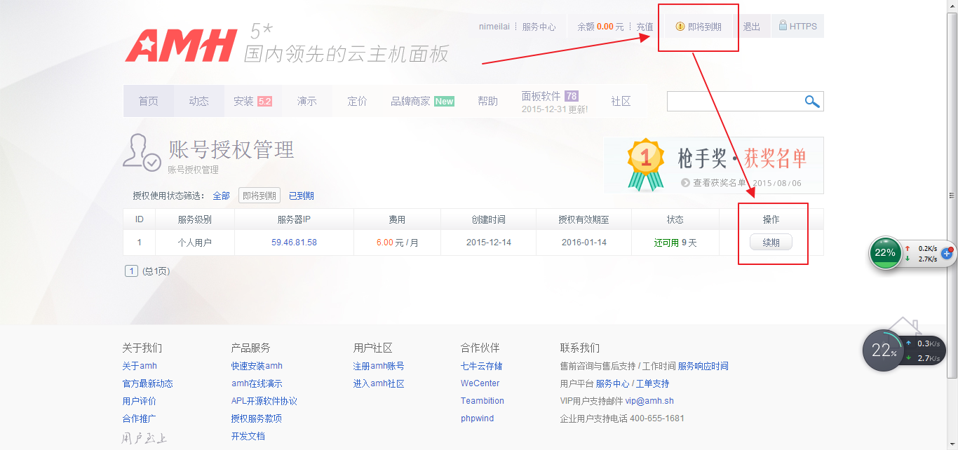 面板如何续费啊 我注册了账号,但是不知道怎样续费 ,查看的时候显示账号授权使用0个