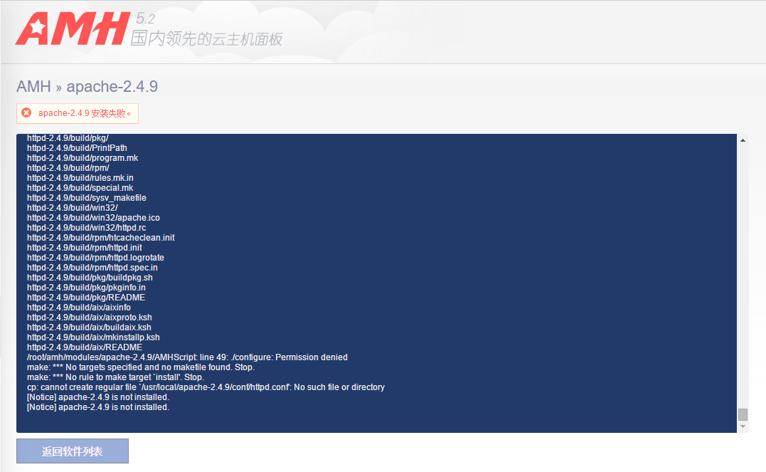 ![]() /root/amh/modules/apache-2.4.9/AMHScript: line 49: ./configure: Permission denied make: *** No targets specified and no makefile found. Stop. make: *** No rule to make target `install'. Stop. cp: cannot create regular file `/usr/local/apache-2.4.9/conf/httpd.conf': No such file or directory [Notice] apache-2.4.9 is not installed. [Notice] apache-2.4.9 is not installed.