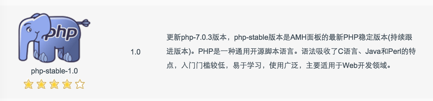 模块分类:服务器软件 模块类别:脚本语言 版本号:1.0 php-stable-1.0 介绍 引用: 发布时间:2016-02-15更新php-7.0.3版本,php-stable版本是AMH面板的最新PHP稳定版本(持续跟进版本)。PHP是一种通用开源脚本语言。语法吸收了C语言、Java和Perl的特点,入门门槛较低,易于学习,使用广泛,主要适用于Web开发领域。 php-stable-1.0 (php7.0.3版本) 关于php7的说明可以查看 https://amh.sh/bbs/post-8218-1-1.htm 本次更新主要是升级至php7.0.3版本,在使用php7.0.3以下版本的用户可以到面板直接升级到7.0.3。 php-stable会是平滑升级,用户网站环境不需做其它更改操作。 php-stable-1.0(php7.0.3).png