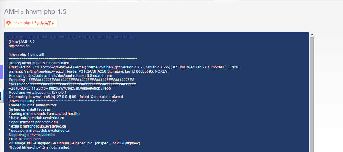 ![]() 今天的怎么安不上了呢,安装几十次了,从来没失败过,AMH5.2 HHVM 1.5, 另一台同样版本,1月安装的,没问题,请各位帮着看看是什么原因,多谢了,
