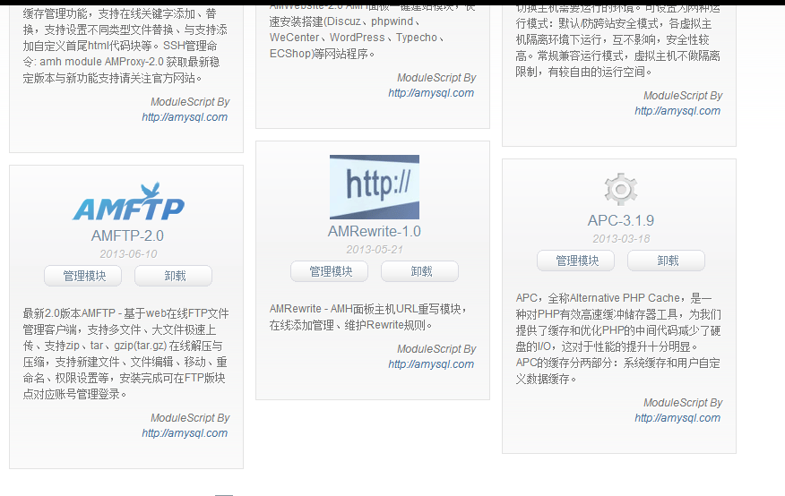 2.分开好些吧,需要再安装一键建站模块。 有些程序有更新了话,一键建站模块更新就好。 如果集成了到面板更新就比较麻烦了。 3.以后会考虑提供多种排序方式。 4.日志清除问题,到amh数据库,清空log数据表就好了。 不过需要面板上清除也简单,先记录。 5.模块搜索,这点可以改进,方便搜索。 6.可以amh ftp add单独增加查看log日志目录的ftp账号。 7.iptables管理会出模块管理。 8.加密就不必要的,amh是开源的。 源码开放、分享更好发展与完善。 谢谢楼主建议与反馈。