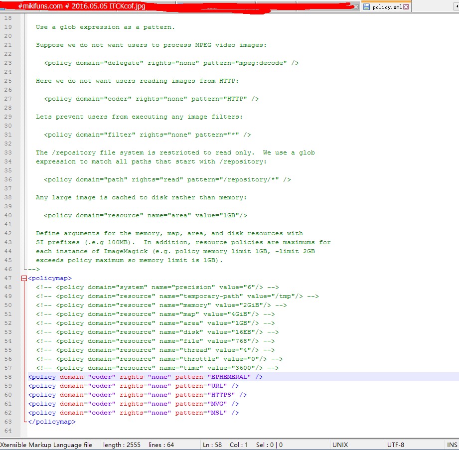 连接主机后进入/etc/ImageMagick目录 编辑policy.xml ![]() <policy domain="coder" rights="none" pattern="EPHEMERAL" /> <policy domain="coder" rights="none" pattern="URL" /> <policy domain="coder" rights="none" pattern="HTTPS" /> <policy domain="coder" rights="none" pattern="MVG" /> <policy domain="coder" rights="none" pattern="MSL" /> ![]() 能否解决尚未清楚(服务器端直接运行 convert 'https://example.com"|ls "-la' out.png 命令无效但是不影响网站使用目前.